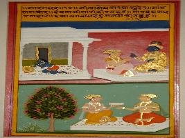 | Description / विवरण | Miniature painting based on Sarangadhar depicting two men in the lower part where one man is telling about the beauty and childhood days of Krishna. He says that the brightness of Krishna is like the open sky. |