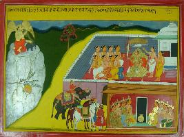 | Description / विवरण | Miniature painting based on Mahabharat - Adi parva. The painting depicts Garuda on a hill while on the other hand Indra is seen talking with Brahmans. Devtas are seen in the lower part of the painting. |