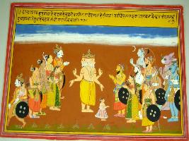 | Description / विवरण | Miniature painting based on Harivansha depicting Brahma trying Moon and Brihaspati to convince them for not to fight and ask Moon to hand over Tara to Brihaspati. |