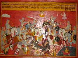 | Description / विवरण | Miniature painting based on Prithviraj Raso depicting fight between the armies of Prithviraj and Panga. Goddess of war depicting on the lower centre part of the painting while Shiv is seen on the top left corner of the painting. |