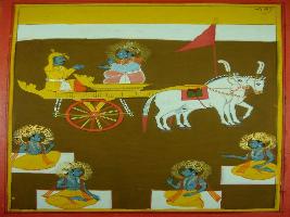 | Description / विवरण | Miniature painting based on Shri Bhagwat Gita. It depicts Krishna preaching Arjun and in the lower part of the painting depicts Krishna appeared in multiple form. |