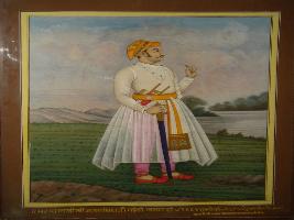 | Description / विवरण | Full size portrait of Maharana Jagat Singh I, in standing position facing left holding a sword in his right hand and a flower in his right hand. He is well dressed and adorned with jewels. |