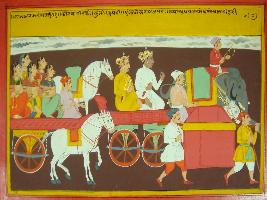 | Description / विवरण | Miniature painting based on Mahabharat - Rajdharma parva. Kaurava lady along with Kunti and Draupadi are depicted on chariot they are going somewhere. Three chariots one elephant and a palanquin in depicted here. |
