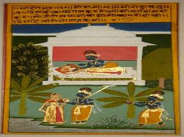 | Description / विवरण | Miniature painting based on Sarangadhar depicting Krishna and Radha, where Krishna is seen trying to convince Radha in the upper part, while in the lower part shows that Krishna and Radha are shown in the garden. |