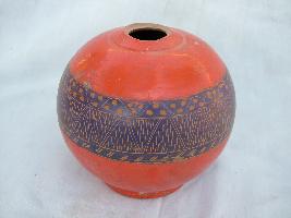 | Description / विवरण | This is a globular shaped surahi. Its body is painted in blue colour on orange background. It s body decorated with geometrical design |