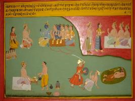 | Description / विवरण | Miniature painting based on Mahabharat - Vana parva. Krishna is depicted with Pandavas, Draupadi is depicted with her five sons. A Brahman is feeding a royal person, and a king is depicted killing a man with sword. Here Draupadi is saying about her 5 sons viz, i Prativindya ii Sutsoma iii Sadanik iv Shrutkirti v Shrutkarma. |