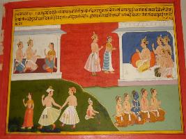 | Description / विवरण | Miniature painting based on Mahabharat - Vana parva. Draupadi is depicted telling that sheg the wife of Pandavas sister of Dristadumna has been brought to Sabha by holding her hairs. Duryodhan has laughed seeing that, and she is angry on Pandavas. Pandavas are depicted sitting in the row. |