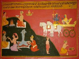 | Description / विवरण | Miniature painting based on Shri Bhagwat Gita. It depicts Arjun asking Krishna to show his Roop power . Krishna shows him his Chaturbhuj image. He says if people praise me then only I show them my Roop but you are the only one whom I have shown my Roop. |