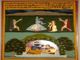 | Description / विवरण | Miniature painting based on Sarangadhar depicting Krishna raising Govardhan mountain on his finger in the upper part of the painting. In lower part, he is sitting with Radha in a garden. He is as strong as he is sensual. |
