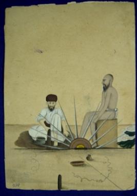 | Description / विवरण | Miniature painting depicting Tarkashi. One man is manufacturing arms and other man is sitting and watching it. |