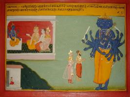 | Description / विवरण | Miniature painting based on Mahabharat - Vana parva. On the left side Vishnu is depicted with Brahma and Shiv on the other side Vishnu is depicted in Vishwaroop. |