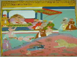 | Description / विवरण | Miniature painting based on Kalila Damana depicting an imperial court where some nobles are telling a story of Kalila Damana. |