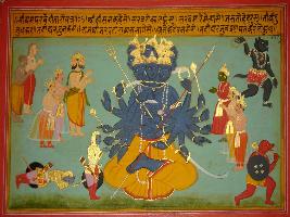 | Description / विवरण | Miniature painting based on Shri Bhagwat Gita. It depicts Krishna preaching Arjun that I am death of everyone and everyone is a part of me. They are because of me. He tells Arjun that you are true so you should fight. All demons are running off and Devas are greeting Krishna s Vikral roop. Arjun is touching his feet. |