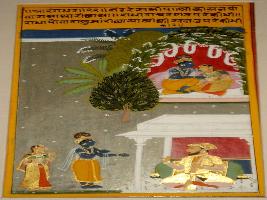 | Description / विवरण | Miniature painting based on Sarangadhar. In upper part, Krishna and Radha are depicted where Radha is touching his feet and Krishna is putting his arms around her. Krishna is taking blessing of Nanda with Radha besides him in the lower part. |