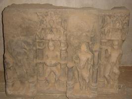 | Description / विवरण | A sculptured architectural fragment, probably part of Lintel of temple, depicts 3 celestial musicians in niche, out of the 3 figures the central one s face is chopped off. |