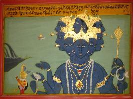 | Description / विवरण | Miniature painting based on Shri Bhagwat Gita. Vishwaroop form of Krishna where Arjun is seen standing with folded hand and this view is also seen by Bhishma. Dhritrashtra is informed by Vidur. |