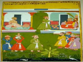 | Description / विवरण | Miniature painting based on Kalila Damana depicting one merchant who had took the khazana to the emperor and ask him what to do with that khazana. The painting has mughal influence. |