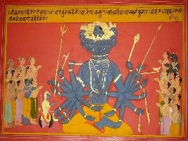 | Description / विवरण | Miniature painting based on Shri Bhagwat Gita. It depicts that Arjun is telling that sun, 11 Vasus, Sandhya dev, Ashvini Kumar, Marut, Gandharva are all from Krishna. |