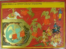 | Description / विवरण | Miniature painting based on Mahabharat - Adi parva. The painting depicts Garuda who crossed the Aganivesh and take away the pot of Amrit and gone Vishnu and Indra a seen of marching is depicted against Garuda. |