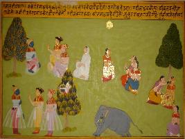 | Description / विवरण | Miniature painting based on Sanskrit drama Malti Madhav depicting Makarand asking Madhav to leave the place as sun is rising. Then Madhav refused to go back and want to see the activities of Malti. Then Madhav replied that lust grabs Madhav in the way kut pakal grabs an elephant. |