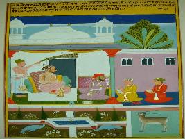 | Description / विवरण | Miniature painting based on Kalila Damana depicting is sitting on couch with Chauri bearer in his palace. Nearby his Minister is sitting. This painting has Mughal influence. |