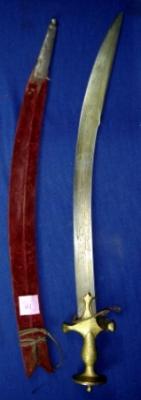| Description / विवरण | Iron Nimcha sword , small in size, single edged with Alamgiri hilt having golden koft work. It is kept in a wooden scabbard covered with velvet cloth. |