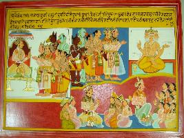 | Description / विवरण | Miniature painting based on Harivansha depicting that king Ayuthi s son was having 20 sons. The eldest son was Raji and he was having 500 sons. They all fight in the devasur sangram. |