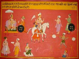 | Description / विवरण | Miniature painting based on Prithviraj Raso depicting Salash talking Prithviraj that he should take so many people like Bhat poet, Nat, young men etc. with him while moving forward. |