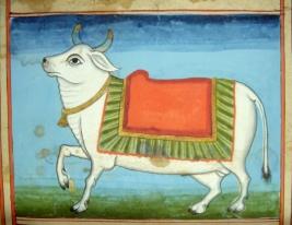 | Description / विवरण | Miniature painting of a bull with a cloth on its back and a bell in the neck. The horns are pointed. It is symbol of zodiac sign Taurus. |