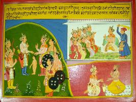 | Description / विवरण | Miniature painting based on Harivansha depicting a king with Indra while in the upper left side the king is talking with his sons followed by a attendants. In the lower left side Indra is seen that talking with a sage. |