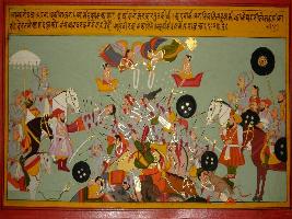 | Description / विवरण | Miniature painting based on Prithviraj Raso depicting Prithviraj along with nobles coming to watch the battle field in which various warriors are killed, Devtas are also coming to see their bravery. Apsaras coming with garlands to honour the dead heroes. |