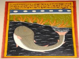 | Description / विवरण | Miniature painting based on Sarangadhar depicting Matasya incarnation of Vishnu depicting its huge figure and trying to save the earth. |