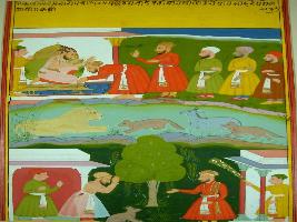 | Description / विवरण | Miniature painting based on Kalila Damana depicting Damana freed from imprisonment and later he is touching feet of Emperor. The painting has mughal influence. |