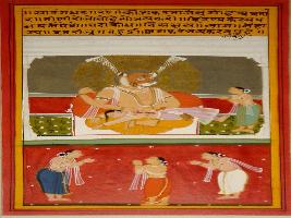 | Description / विवरण | Miniature painting based on Sarangadhar depicting Narasimha incarnation of Vishnu killing demon Hiranyakashyap and child Prahlad is standing besides him with folded hands. |