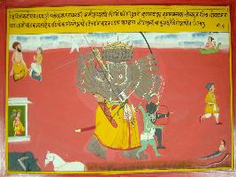 | Description / विवरण | Miniature painting based on Harivansha depicting Dhanwantari praying god and getting blessings. Then a son is born in king Dhanu s house and named Dhanwantari. He came to Bhardwaj and got the knowledge of Aayurved. |