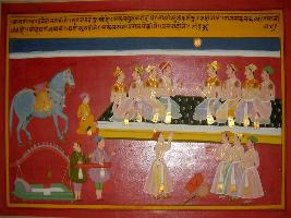 | Description / विवरण | Miniature painting based on Sanskrit drama Malti Madhav depicting natas and musicians seeking permission from the kings and queens to start the drama as the sun rises. |