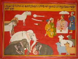 | Description / विवरण | Miniature painting based on Shri Bhagwat Gita. It depicts, horse of Sun named Chitra is greatest among horses, Airavat is greatest among elephants. king is biggest among human, Vajra is deadliest among weapons and Kamdhenu is greatest among cows. |