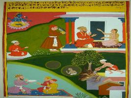 | Description / विवरण | Miniature painting based on Kalila Damana depicting, a man sitting and telling to two other person at lower right part. At the lower left part, slave of a merchant is shown putting water on house which is on fire. At the upper right he is shown sitting. At the upper left, merchant is talking with his wife in his palace and slave is shown with a pigeon. Painting has Mughal influence. |