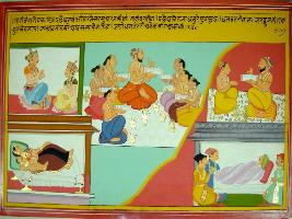 | Description / विवरण | Miniature painting based on Harivansha depicting Dhanwantari s son Ketuman. His son was Bhimarath. His son was Devdasson, his son was Bhadra Sen. It also depicts Janmejaya asking sage Vaispayan about the story. |