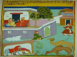 | Description / विवरण | Miniature painting based on Kalila Damana depicting a merchant talking to his wife in his palace at upper part. A slave is shown sitting near palace. Horses are shown kept in stable, camels are shown tied. Vyadh is shown coming toward a palace. Painting have Mughal influence. |