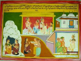 | Description / विवरण | Miniature painting based on Harivansha depicting Dhanwantari s son Ketuman. His son was Bhimarath. His son was Devdasson, his son was Bhadra Sen. It also depicts Janmejaya asking sage Vaispayan about the story. |