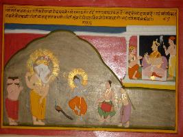 | Description / विवरण | Miniature painting based on Sanskrit drama Malti Madhav depicting Ganesh getting angry and all ganas playing music, Devtas are dancing and even Kartikeya and his peacock is also trying to make him cool. On the left side of the painting a royal figure is depicted with two attendants. |