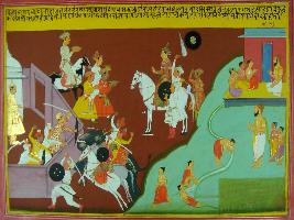 | Description / विवरण | Miniature painting based on Mahabharat - Adi parva depicting Janmejaya going towards Takshila and establishing his kingdom there. The left part depict sage Dhaumya teaching his three disciples and asking Aruni, one of his disciple to stop the flow of water in the field. When Aruni couldn t stop flow of water he laid down in the canal. By seeing this his guru was satisfied and gave him knowledge. |