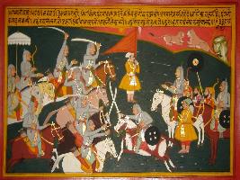 | Description / विवरण | Miniature painting based on Prithviraj Raso depicting Roysal Rathore attacking Prithviraj and both of them are fighting as if two lions are fighting. It also depicts 20 thousand army coming and joining the army of Panga. |