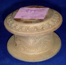 | Description / विवरण | Terracotta box having circular lid, cylindrical body and flaring base. It is decorated with punched floral designs at all sides. |