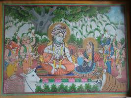 | Description / विवरण | This painting reporesents Shiva along with his consort Parvati in seated posture. Shiva is having snakes on head and in neck, and a garlend in neck. Parvat is offering something with her both hands is a glass to Shiva Besides Shiva and Parvati Ganesh, one five headed figure Kartik two male figure Bero have been shown. Also one bull and tiger in their in front of the Shiva and Parvati. In the backgrond sky and springs, on the foreground flower can be seen. It is mounted in a wooden from now |