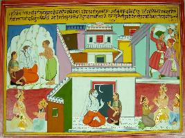 | Description / विवरण | Miniature painting based on Harivansha depicting Shiv and Parvati talking to a sage in Himalaya. Below them a king and queen is seen. Next to it Shiv and Parvati is seen in conversation. At the upper left side four men are seen while lower left side depicts a king with his two sons. |