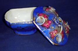 | Description / विवरण | Small ceramic box with lid. The lid has applique floral designs and painted with golden floral pattern. |