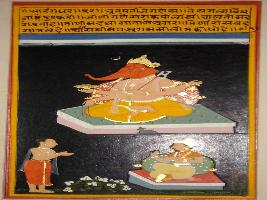 | Description / विवरण | Miniature painting based on Sarangadhar depicting four armed Ganesh and Sararangadhar praising Ganesh and standing in front of a king. |
