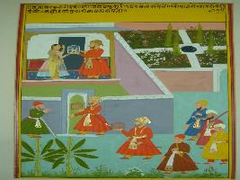 | Description / विवरण | Miniature painting based on Kalila Damana - two jackals depicting a noble purchased the cage and parrot from ghulam and gifted to his wife. Painting has Mughal influence. |